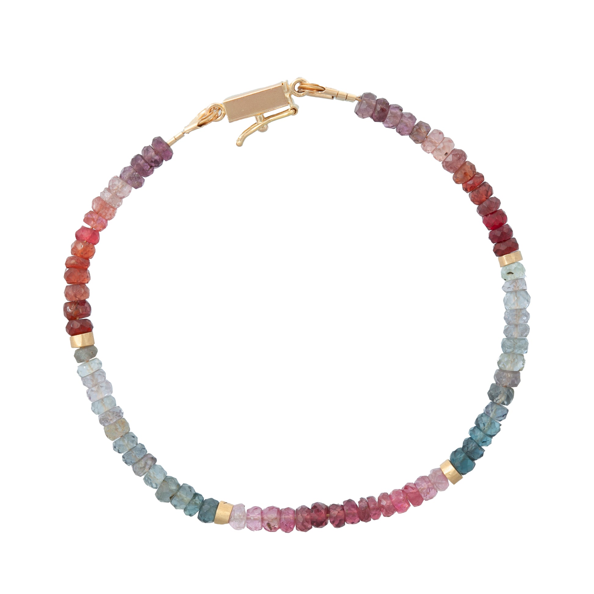 This spinel bracelet was beaded in house. It has a 14k yellow gold clasp and 4 14k yellow gold beads, that were made by Sarah. It measures 6.5 inches.
